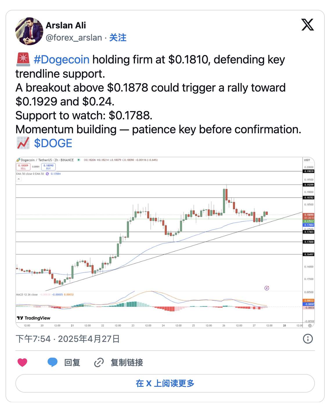 儘管截至撰稿時小幅下跌1.4%,但截至4月27日,DOGE仍在約0.1810美元附近交投,成功守住先前突破的漲幅。