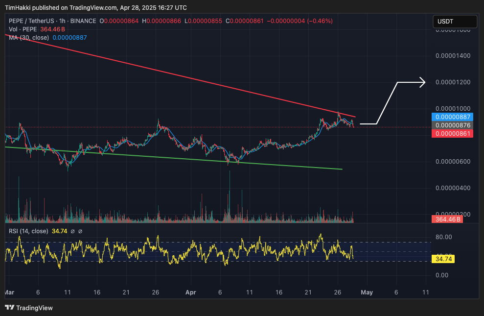 與 Shiba Inu 類似,技術面也顯示出可能即將突破下降楔形整理形態的跡象。但要注意的是,由於 Pepe 本質上是純粹的迷因幣,缺乏實際應用場景,因此其突破幅度在很大程度上仍取決於外部因素。