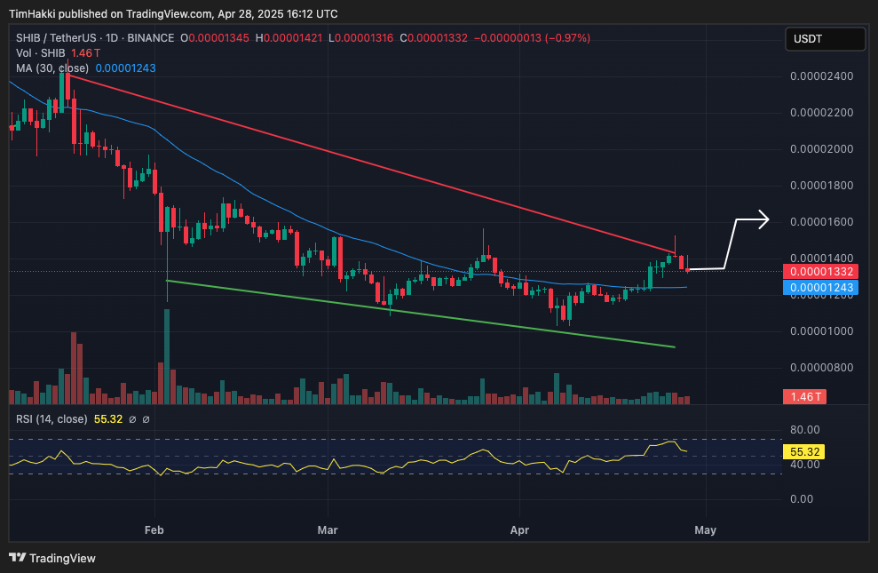 在截至撰文,Shiba Inu 上漲 6.5%,交易價格為 $0.00001338。過去幾個月裡,它似乎正在突破下降楔形形態,這通常預示著即將迎來一波上漲行情,可能會推動價格上漲至 $0.000016 這一強支撐位。不過,進一步上漲仍將取決於 Shiba Inu 生態系統的發展以及整體加密市場的趨勢。