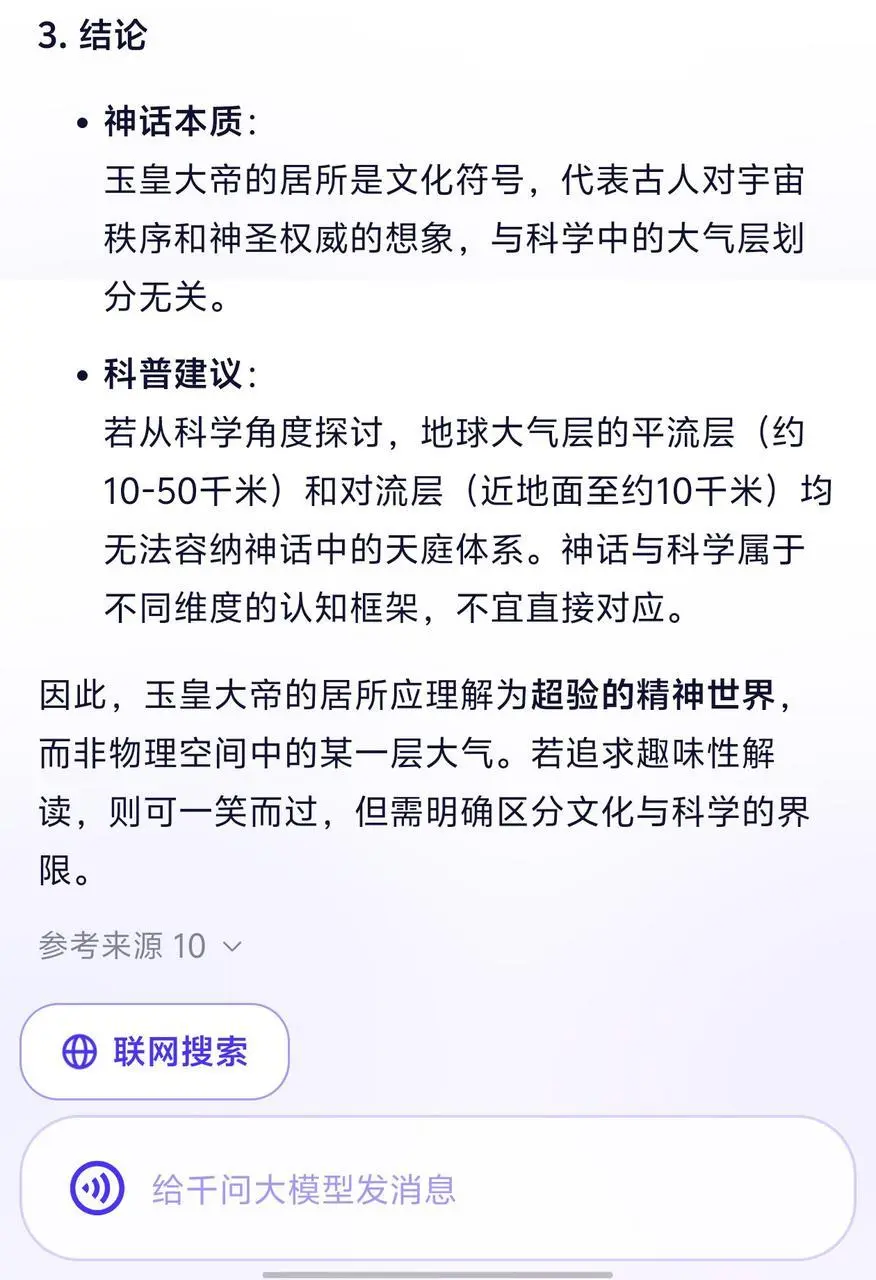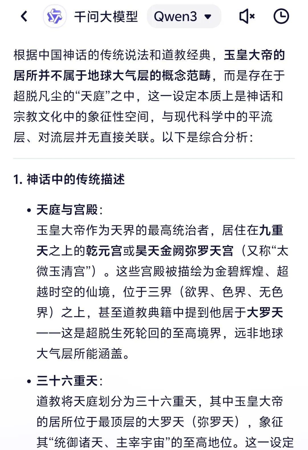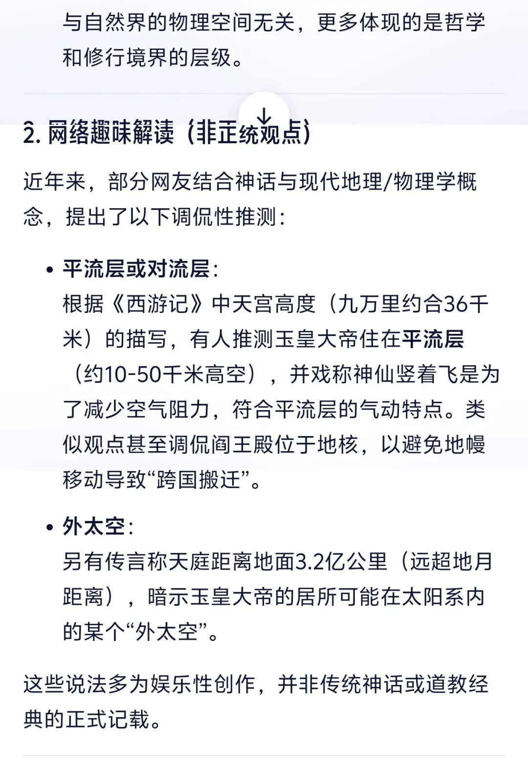 它先嚴謹地引用神話描述,明確指出玉皇大帝居住在天宮,並解釋了天宮與大氣層的物理區別;緊接著又補充了網路趣味解讀(非正統觀點),既正經回答,但也適度皮一下。