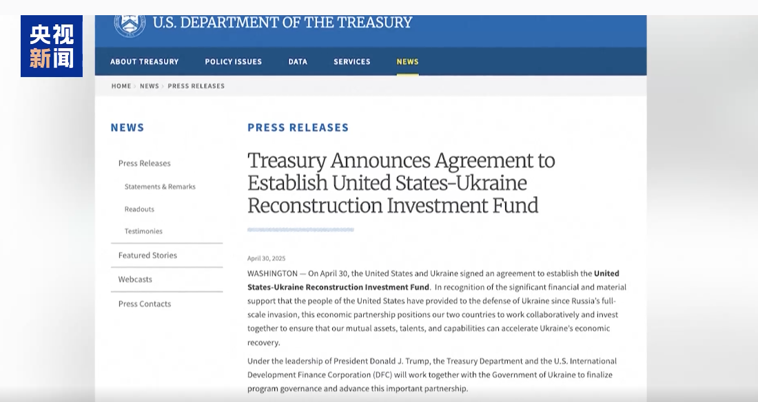 烏克蘭當地時間5月1日,烏克蘭第一副總理兼經濟部長斯維裡堅科在社交媒體上透露,根據烏克蘭總統弗拉基米爾·澤倫斯基與美國總統唐納德·川普達成的協議,她與美國財政部長斯科特·貝森特共同簽署了《美烏重建投資基金成立協議》,即此前各界所稱的“美烏礦產協議”。