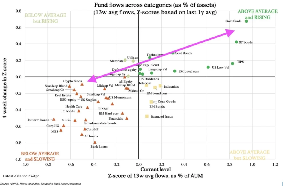 根據德意志銀行資產配置部在 2025 年 4 月的 EPFR 資金流動圖示,加密資產基金(Crypto Funds)目前處於「低於平均、趨勢惡化」的象限,反映出市場資金流出速度加快,且尚未見到轉折跡象。這背後涵蓋的一個重要問題:這是短期情緒波動,還是加密資產在當前風險環境下遭遇結構性拋售?