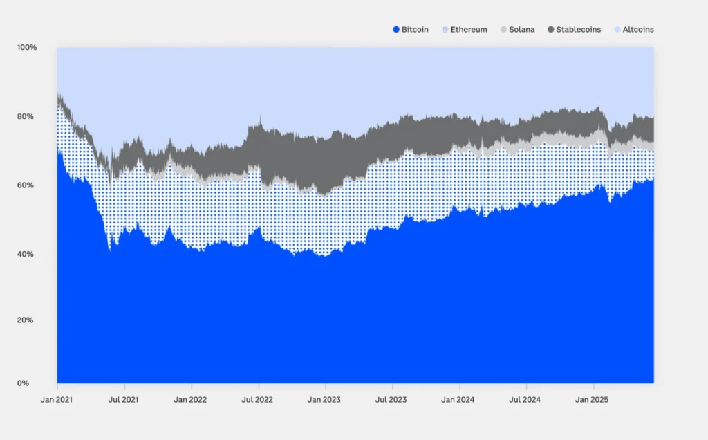 同時,根據 Coinbase 的《Charting Crypto 2025 Q2》報告,2025 年第一季後總加密資產市值(不含比特幣)自高點下跌 41%,Altcoin 市場尤其慘烈,整體風險資產市場進入明顯的收縮期。在 Coinbase 與 Glassnode 的觀察中,這一波收縮主要受到全球利率走高、財政緊縮以及市場對於地緣政治風險升溫的影響,導致市場風險承受能力下降。