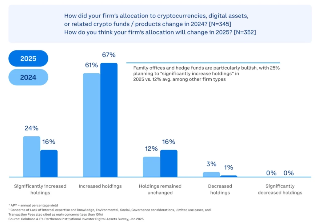 然而,Coinbase 與 EY-Parthenon 在 2025 年 1 月針對 352 家機構的調查結果卻顯示,超過 86% 的受訪機構已持有或計畫在今年配置加密資產,表明中長期資金布局仍具潛力。這種短期悲觀與中長期樂觀的矛盾,構成了撰寫本次 Q1 回顧的核心動機。