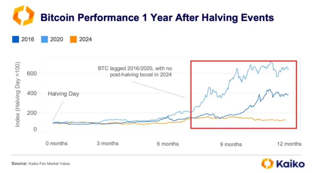 市場的「流動性偏好轉變」亦十分明顯。根據 Kaiko 的分析,本輪比特幣減半後市場反應異常疲弱,一個月內比特幣價格下跌 14%,遠低於歷史減半後平均 6% 至 8% 的漲幅。同時,交易所訂單簿的深度下降,流動性惡化,使得市場對價格波動的承受力進一步降低。