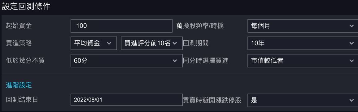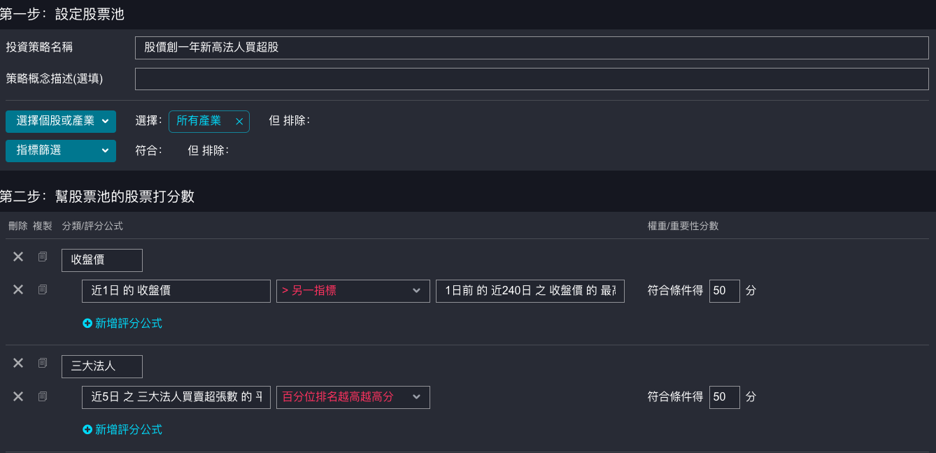 首先,在設定股票池當中,我們不做任何條件的篩選,而在幫股票池的股票打分數中,我們設定如下: