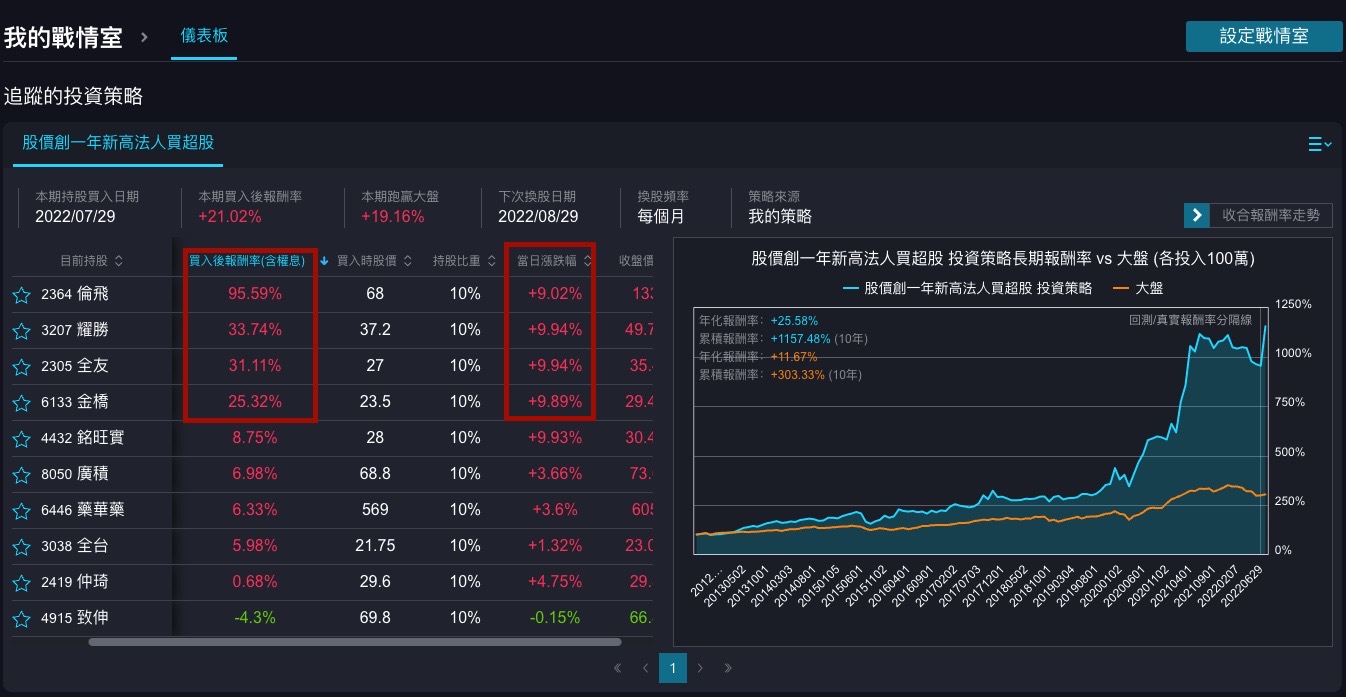 在我的戰情室當中,我們可以看到這個策略,在07/29買入這10檔標的之後,有很好的投資績效,跑贏大盤12.63%,其中又以2364倫飛的報酬率(79.14%)最高,因此,我們可以得證,此測投資策略近一個月有亮眼的投資表現哦👍