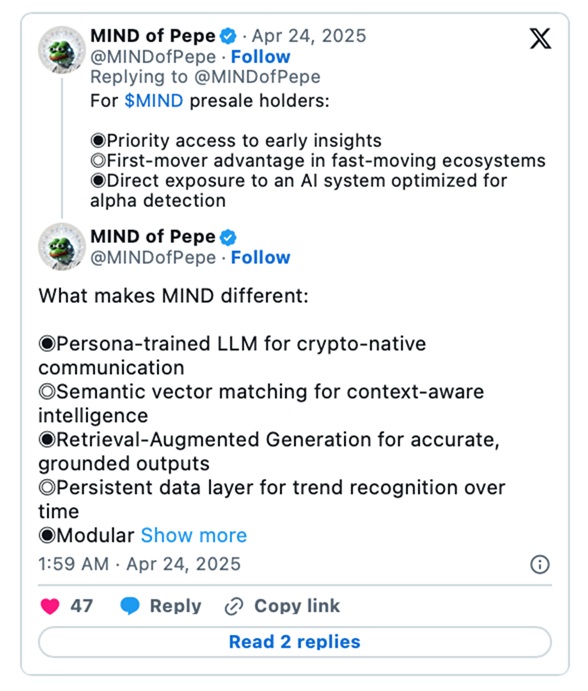 當前,MIND of Pepe 的早期預售階段進入最後29天。投資者不僅將獲得代幣,還將在 5月10日 搶先體驗該 AI 代理的全部功能,領先於正式上線交易所的節奏。