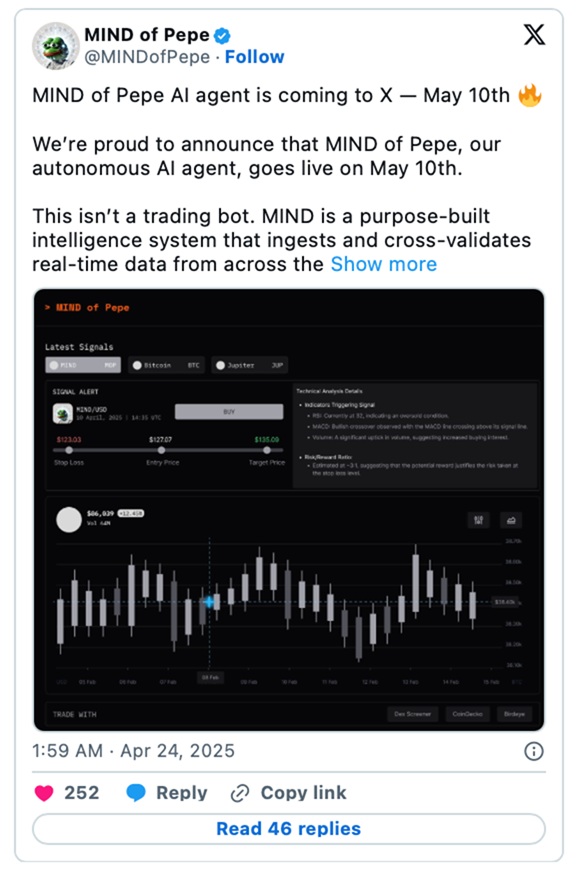 與傳統交易機器人不同,MIND of Pepe 不受預設參數限制,具備獨立決策能力。不僅能回應市場變化,甚至可以引領趨勢,成為鏈上有影響力的“AI KOL”。