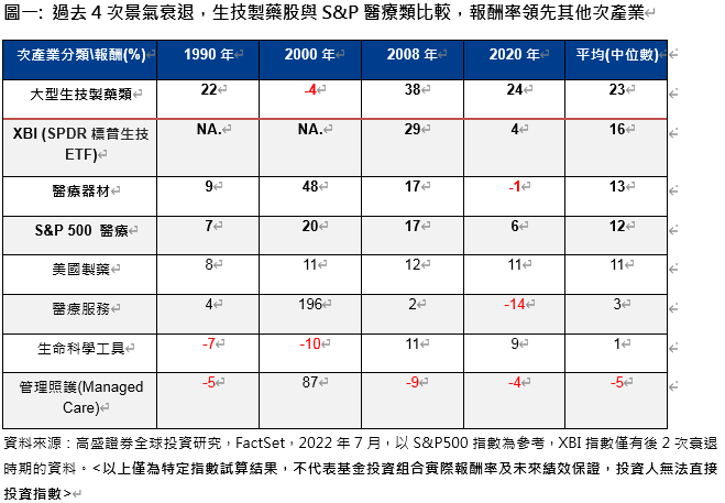 歷史經驗: 生技股於衰退期間漲幅領先