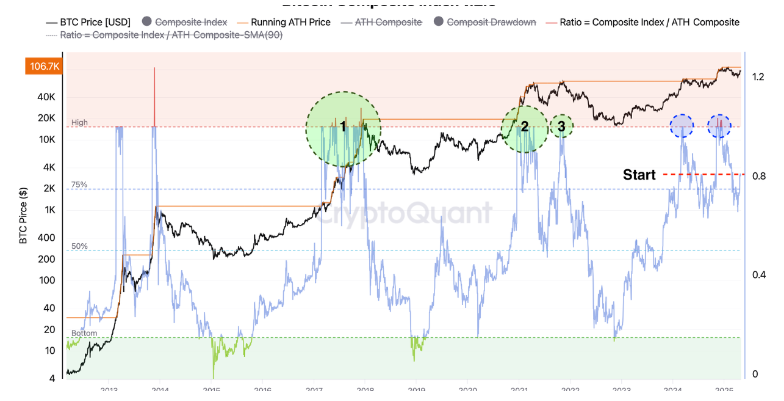 在基本情境下,預計比特幣價格將在9萬美元至11萬美元之間波動。此時比率將在0.8至1.0之間變化,反映市場參與者之間的資金累積和獲利了結相互平衡的狀態。