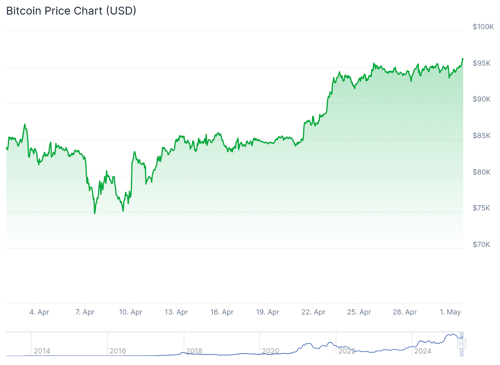 自 4 月 7 日一度回調至 $74,000 後,比特幣隨後強勢反彈,現已在 5 月初站上 $96,000,累計自低點反彈幅度高達 29.7%,展現出驚人的多頭動能。