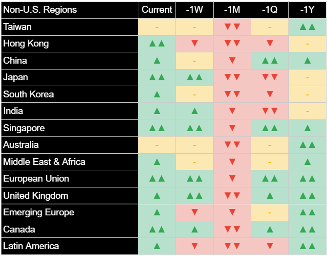 從分析角度來看,今日強勁且廣泛的反彈已推動多數類股的近期特性出現顯著的改善。我們的分析目前指出,資訊科技、金融、非必需消費品、工業和通訊服務類股的近期狀況有利。能源、原物料和房地產類股已從先前的不利評估改善至中性狀態。醫療保健類股的狀況已從極為不利改善至中度不利,必需消費品類股則維持中性。我們預期,此普遍性的改善若能持續,可能預示市場領漲力道和整體趨勢出現更持久的轉變。