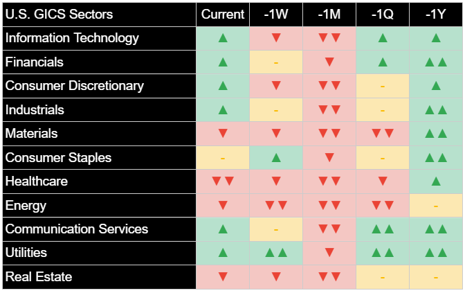 From an analytical perspective, today's powerful and broad rally has driven significant positive shifts in the near-term character for most sectors. Our analysis now indicates favorable near-term conditions for Information Technology, Financials, Consumer Discretionary, Industrials, and Communication Services. Energy, Materials, and Real Estate have improved to a neutral state from previously unfavorable assessments. Healthcare's condition has improved from pronouncedly unfavorable to moderately unfavorable, and Consumer Staples remains neutral. We anticipate that this widespread improvement, if sustained, could signal a more durable shift in market leadership and overall trend.