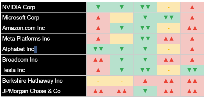 Interpreting the underlying analytical picture, the sharp positive price action today has led to notable improvements in the near-term market character for many of these leading companies. Our analysis indicates that conditions for Microsoft Corp, Amazon.com Inc, Meta Platforms Inc, Broadcom Inc, and Tesla Inc now appear favorable in the near term. For Apple Inc and Alphabet Inc Class A, conditions improved from pronouncedly unfavorable to moderately unfavorable, while NVIDIA Corp remained in a moderately unfavorable state despite its strong daily gain. JPMorgan Chase & Co maintained its favorable assessment, and Berkshire Hathaway Inc Class B stayed neutral. We anticipate that continued positive market sentiment could further improve these readings, though some names still require more evidence to signal a complete analytical turnaround from recent weakness.