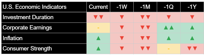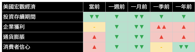 我們整套經濟指標今日展現了情勢的變化。分析顯示,投資存續期間的訊號仍極為不利,未見改善,反映出市場對長期經濟風險持續且強烈的規避。企業獲利前景維持中性。值得注意的是,消費者信心和通膨訊號今日雙雙走強,分別從中性/中度正向轉為中度正向和強勁正向。這表明市場衍生的指標今日正捕捉到消費者韌性增強和通膨預期上升的訊號,此為一關鍵發展。這種極為不利的投資存續期間與走強的消費者信心和通膨並存的組合,呈現出一種複雜且可能處於循環後期的動態,值得投資者密切關注。