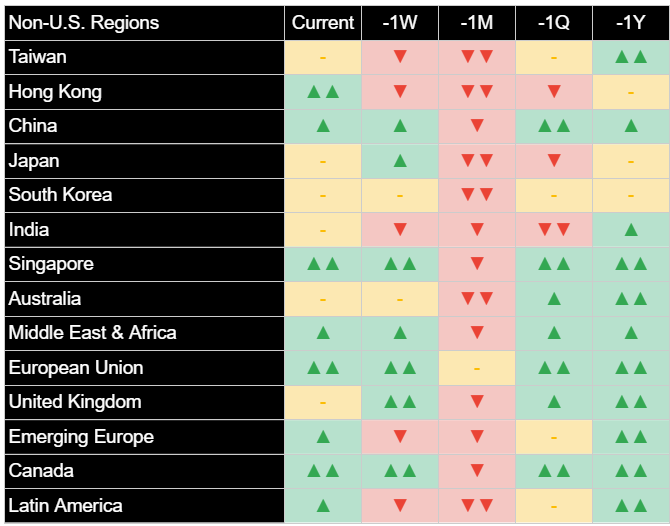 已開發市場大多收低:歐洲股市下跌-0.23%,日本股市下跌-1.11%。美元走強可能構成不利因素。分析持續顯示,從較長的時間區間來看,這些地區的潛在特性普遍為正,但它們對全球風險偏好的轉變仍然敏感。