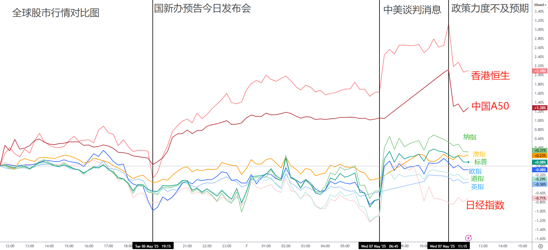 中國AH股市:全天表現優異,中美談判的利好令上述的亞洲系資產表現優異。尤其是在昨日歐盤時段,國新辦宣佈將於今日早間舉辦新聞發佈會,引發市場對新一輪政策刺激的期待。令AH股市逆勢大漲。