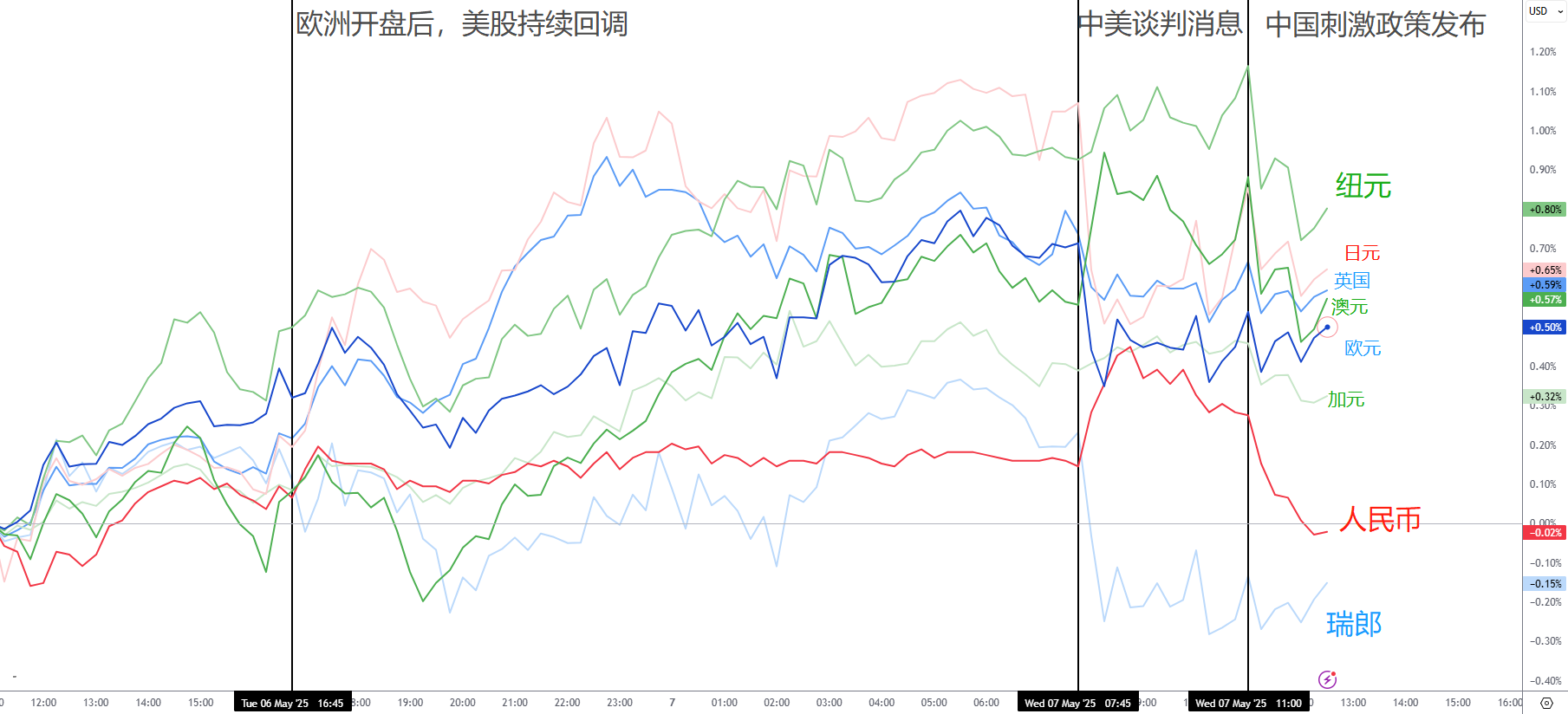 澳元與紐元:歐盤到美盤受到中國AH股市影響較大,隨A股指數一同上漲,並在今日早盤中美談判的消息刺激下漲至最高點。但同樣的,當刺激政策發佈,A股下跌時,這兩個貨幣也大吐漲幅。