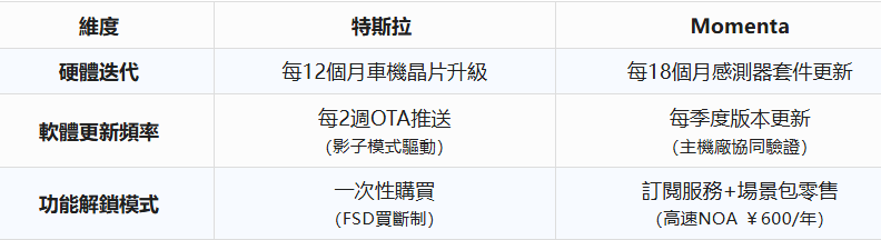特斯拉在長尾問題解決上更激進(直接刪除傳統規控模組),Momenta保留多演算法投票機制確保安全冗餘
