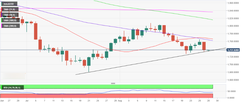 從技術上講,金價重挫將挑戰關鍵上升趨勢線支撐位,目前為 1,735 美元。金價需要日線收於該水準下方,才能將上周五跌勢擴大至上周低點 1,728 美元。