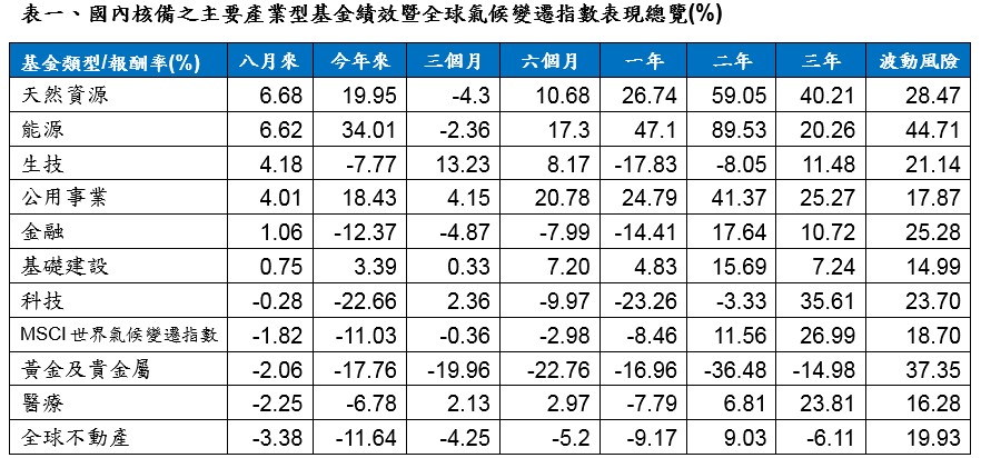 主要股票暨產業型基金:原物料反彈助推能源、天然資源類股;題材加持,生技股走強