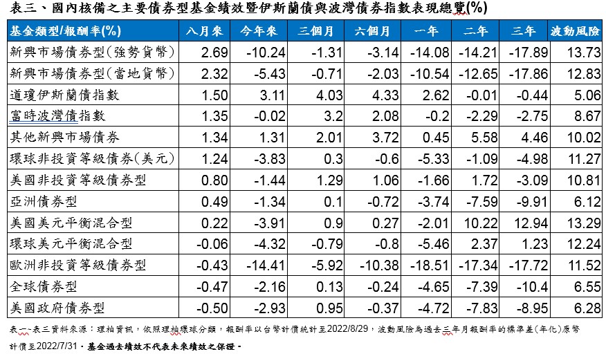 儘管投資人認為聯準會將持續緊縮,但新興債市的吸引力在經歷上半年的賣壓後逐漸浮現,資金回流帶動新興市場強勢貨幣債基金、當地貨幣債基金近月分別上漲2.69%、2.32%,表現最強勢。波灣債、伊斯蘭債分別上漲1.35%、1.5%,因石油出口國持續受惠於高油價,波灣國家財政收支大幅改善支撐了債券表現。美國政府債券基金近月表現居末,因受到聯準會鷹派升息預期的影響而下跌0.5%。