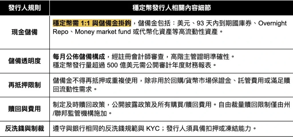 發行人需以 1:1 儲備金(如美元、國庫券)支持穩定幣、每月公開審計、制定贖回政策、遵守反洗錢規範。這些監管有助於確保儲備穩定、提升市場透明度,降低非法活動風險,促進穩定幣市場的長期可信度。