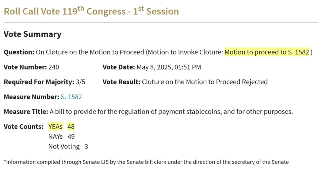 《穩定幣法案》(S. 1582, GENIUS Act)原本為共和黨與民主黨攜手聯合策畫,然因為近期川普迷因幣與 USD1 爭議,民主黨參議員要求修改法案約束川普行為,使 5 月 8 日法案投票受阻,最終僅 48 票同意,低於通過門檻 60 票。