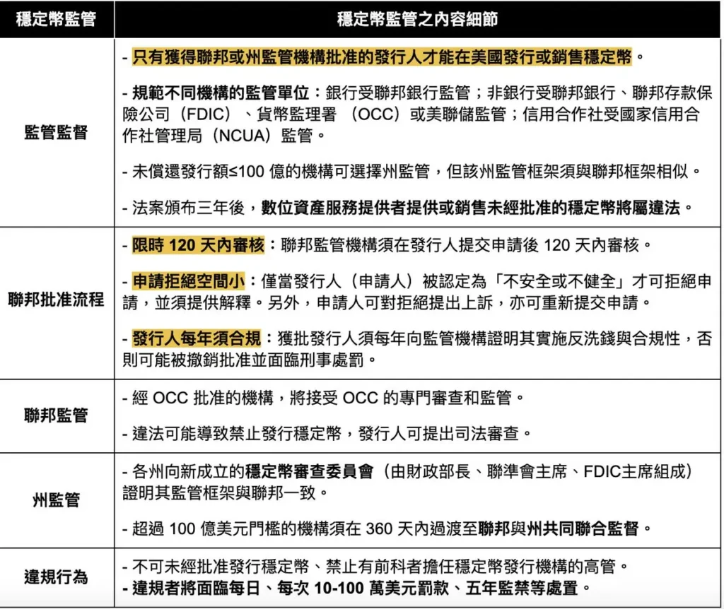 穩定幣發行與營運監管:規範發行與核准流程,發行人需接受年度合規與反洗錢審查,並明確劃分聯邦與州政府的監管職責。法案也納入特殊情況下的例外條款,便於市場波動時維持信心。