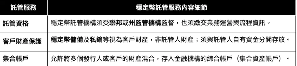S.1582 GENIUS 法案除了清楚定義關鍵用詞,如支付穩定幣、發行人、虛擬資產、虛擬資產服務提供者(加密貨幣交易所)等,也針對穩定幣監管、託管服務等做規範,以下列出三個主要的監管: