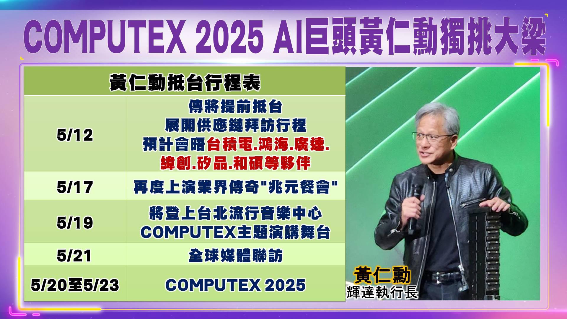 黃仁勳將提前於5/12抵台,這次不只是為國際電腦展而來,更有可能是為了全球籠罩美國對等關稅與地緣政治陰霾下,親自坐鎮與台供應鏈緊急磋商因應對策,由於時機敏感、行程緊湊,動向也備受關注。