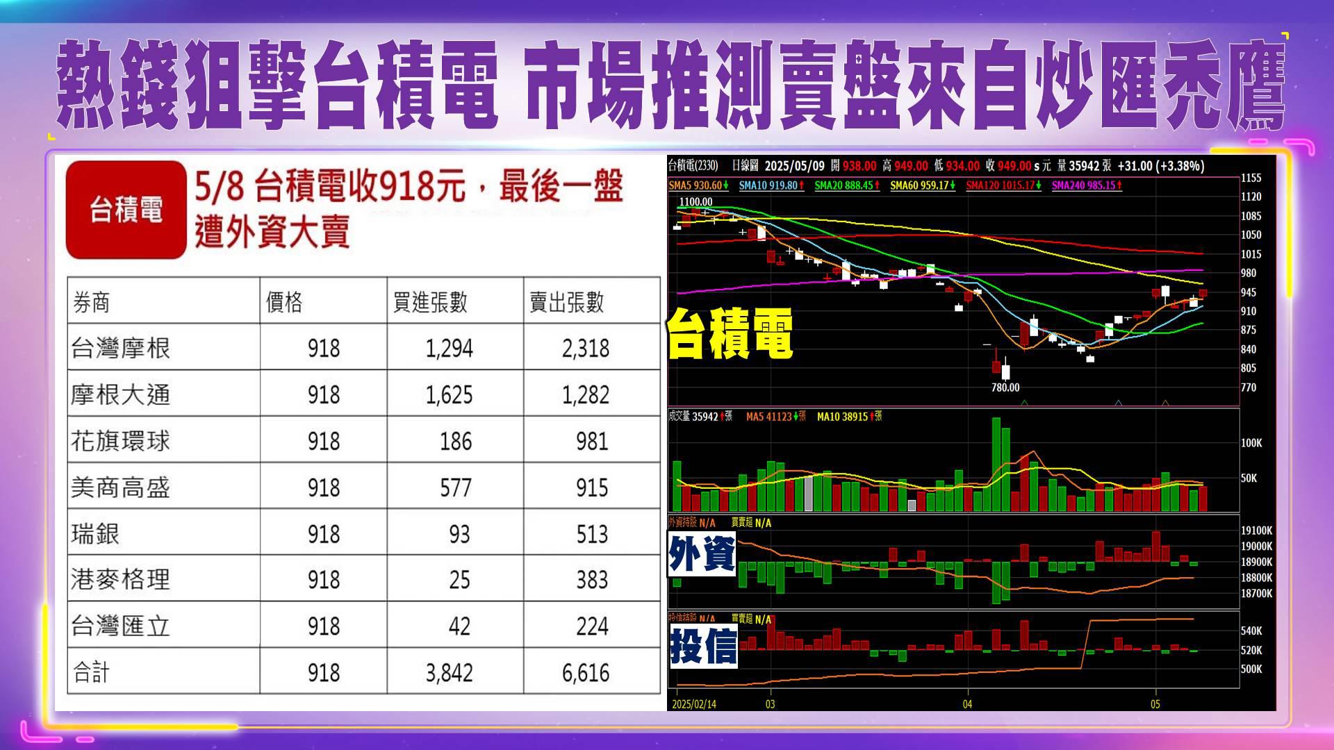 觀察券商進出資料,外資昨5/8反手調節台積電3,055張、28.3億元,而以最低價918元成交的大額賣盤,主要來自摩根士丹利、摩根大通、花旗環球、高盛、瑞銀、麥格理等外資券商,從383至2,318張不等。