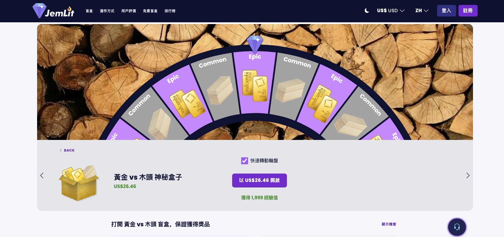 Jemlit 近期推出的「Gold vs Wood」系列盲盒掀起一陣熱潮,玩法相當簡單:每個盲盒售價$26.46美元,參與者有機會抽中 Valcambi 正品金條,重20克價值$3,309美元的金條。即便未中獎,也能獲得木頭製成的安慰獎,並同時獲得平台經驗值以累積帳號等級,等級提升後,玩家可解鎖更多抽獎權益、專屬優惠與特殊活動資格。若對抽中的獎項不滿意,也可兌換回與獎品同等價值的點數,繼續參與抽獎。