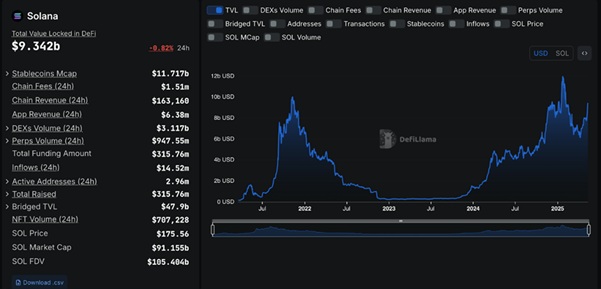 Solana在DeFi領域的總鎖倉量(TVL)也正在快速成長,正朝其歷史高點118億美元逼近。目前TVL已達93.4億美元,根據DeFi Llama數據顯示。同時,其穩定幣總市值上週也突破130億美元,這一訊號強烈表明Solana生態中的DeFi正持續擴張,勢頭強勁。