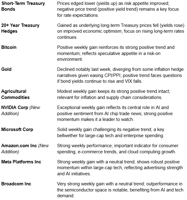 International equity markets also benefited from the improved global sentiment. Europe Equities gained +2.31% and Japan Equities added +0.92%. China Equities (+1.81%) also advanced, likely supported by its domestic credit data showing gradual improvement, which might signal further policy easing there. Other asset classes reflected the risk-on mood: Treasury bond prices declined as yields rose on the positive trade news (Short-Term Treasuries -0.06%, 20+ Year Treasury Hedges +1.76%). WTI Crude Oil prices (via USO) rose +3.81%. Gold, however, retreated significantly, falling -3.41% for the week, a notable pause in its year-to-date rally. Bitcoin gained +2.74%.