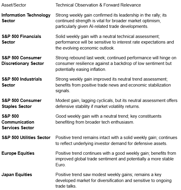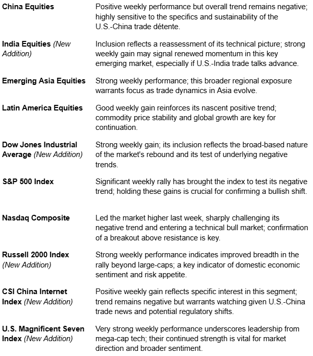 Technically, after last week's strong rally which saw the S&P 500 recover its post-"Liberation Day" losses and the Nasdaq enter a bull market, major U.S. indices are testing key resistance levels. A period of consolidation above these levels or further upside follow-through would be constructive for confirming a bottom and a potential new uptrend. We will be closely watching if market leadership continues to broaden beyond the initial tech-led rebound. The key for goal-oriented investors is to remain focused on a well-diversified strategy, using rebalancing to align portfolios with long-term objectives, while acknowledging that periodic volatility related to policy shifts should still be expected.