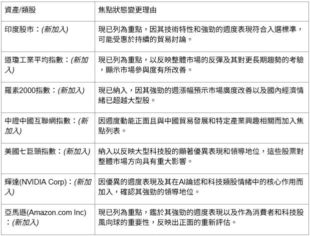 根據我們對不斷演變的技術訊號的評估,並比較重點資產(E欄中模型百分比 > 0者)與前一周的資產,本周焦點列表作出以下調整: