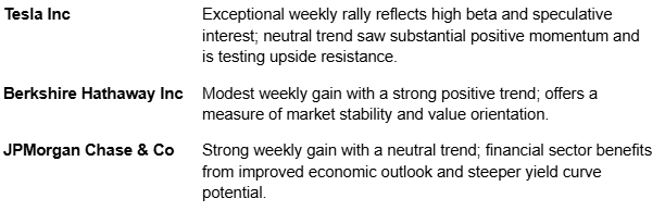 Performance among prominent U.S. companies on our Focus List was overwhelmingly positive, led by technology and growth names. NVIDIA gained an impressive +15.36% last week, directly benefiting from positive sentiment around AI chip trade. Other large-cap tech stocks like Tesla (+22.88%), Amazon.com (+7.03%), Meta Platforms (+7.08%), Microsoft (+3.67%), and Broadcom (+10.03%) also advanced significantly, reflecting renewed investor enthusiasm.