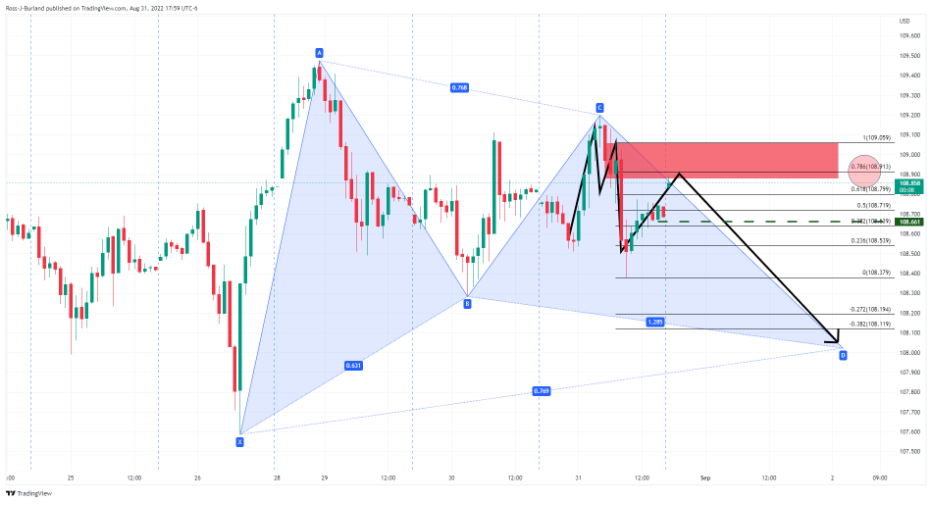 美元指數構築M形態已提振美元接近頸線並接近 78.6%斐波位,但若匯價維持遇阻,則匯價將出現下跌以完成加特利形態。從下跌前景來看,美元指數關鍵支撐位處在 108.661。
