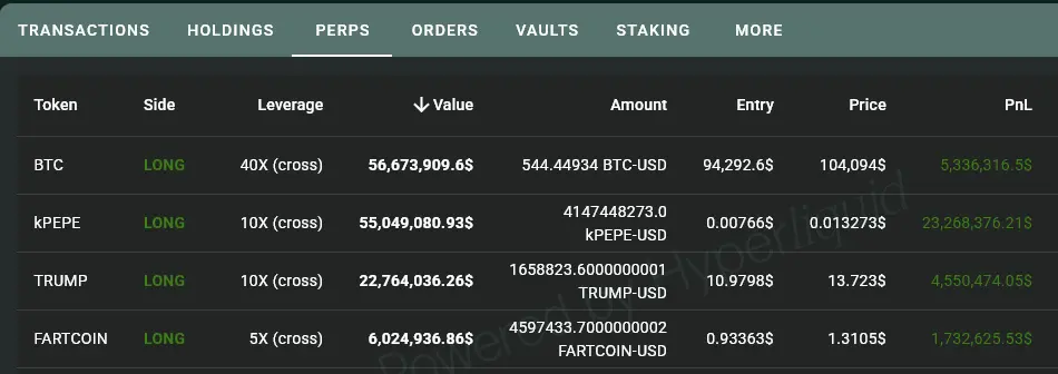 James Wynn 早期的成功是來源於現貨市場的迷因幣交易,但他真正登上巔峰的舞台是Hyperliquid 上的衍生品操作。他採用 5 倍至 40 倍的高槓桿策略,集中於比特幣 ( BTC ) 和迷因幣 ( PEPE,TRUMP和 FARTCOIN)。