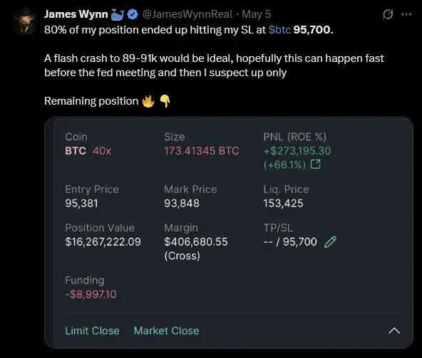在 2025/05/04 James Wynn 在 X ( 推特 ) 發了一則推文是關於他開了價值 40,000,000 倉位的空單,並且止損設在 95,700 。