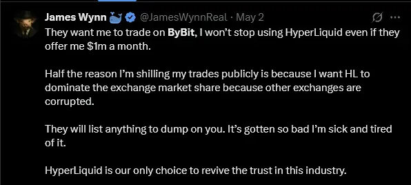 James Wynn 對 Hyperliquid 的偏愛是來源於其對 Bybit 交易所的不滿。他公開批評 Bybit 等平台操縱代幣上架,損害散戶利益,並宣稱即使每月獲 1,000,000 美元的報酬,也不願放棄Hyperliquid 的去中心化原則。