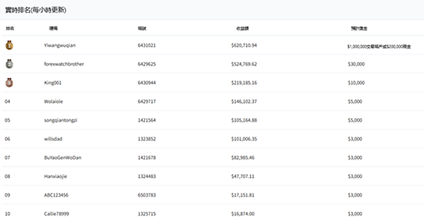 青訓營部分,前兩名選手近日選擇出金並未繼續交易,戰線可能告一段落。而昨日新加入的 @King001 表現不俗,短時間內就衝上第三名,回報率已達22倍,並迅速吸引首批跟單者,展現黑馬潛力。