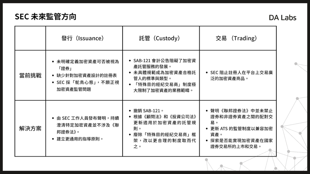 未來,DA Labs 也將會持續每月追蹤 SEC 在加密政策上的最新進展,提供第一手的消息彙整和市場分析,幫助一般散戶快速了解當前監管情勢。因此,記得關注 DA Labs ,可以掌握最新的 Web3 產業脈動。