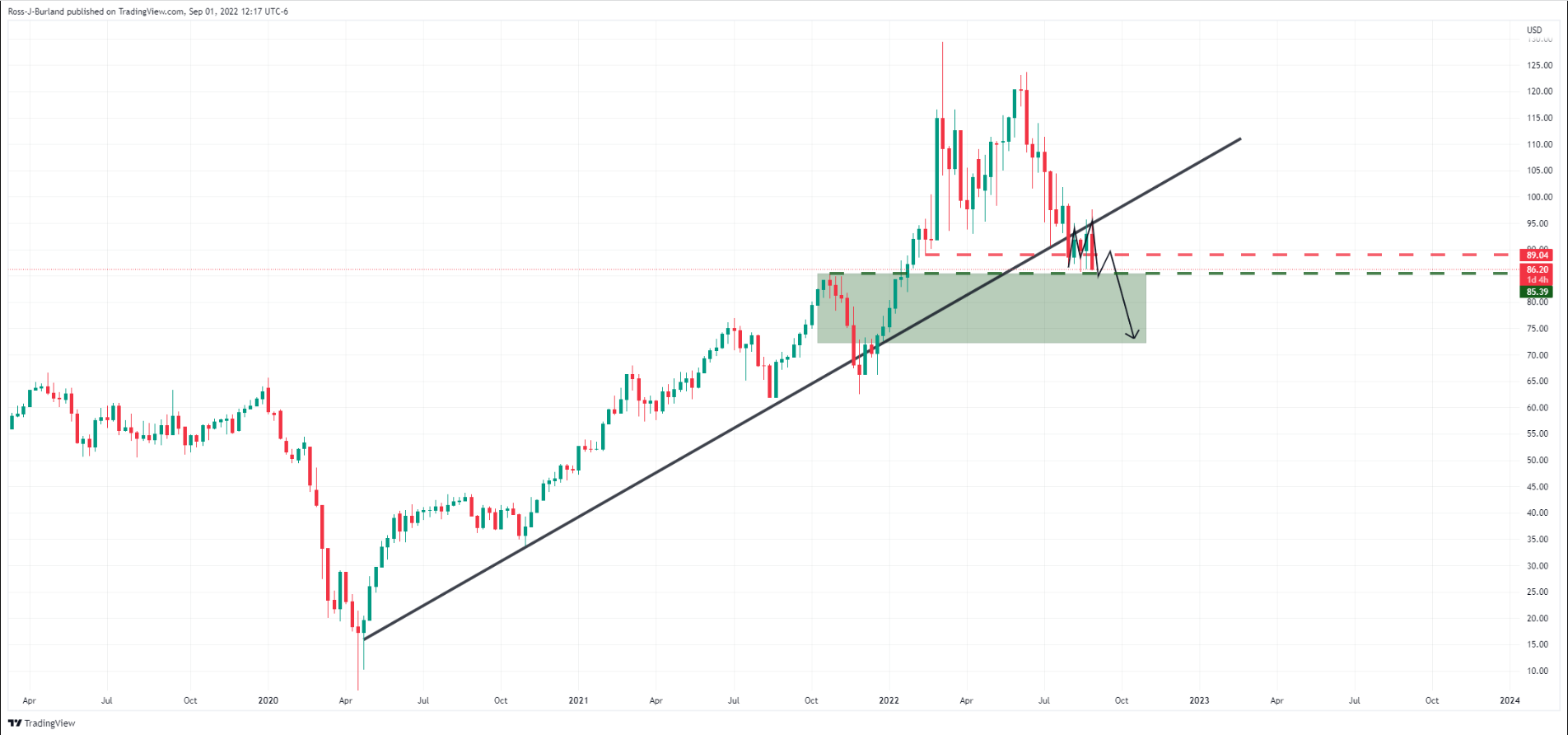 周圖顯示WTI油價突破 89.00 附近的關鍵形態水準,並且若WTI油價實現下行突破,將指向前期擺動高點 85.39 美元。 WTI油價將構築M形態,WTI油價有望測試89.6美元,然後WTI油價年內剩餘時間將有望全面下跌測試 70 美元。