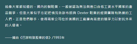 在2015年回購波克夏過去的50年時則提到:“自錯誤收購 Waumbec 以來,我還是犯了很多錯誤。最可怕的是收購 Dexter 鞋業。當我們於 1993 年收購這家公司時,它有著出色的記錄,在我看來全然不像煙蒂股。然而,由於外國的激烈競爭,它的競爭優勢很快蒸發了。而我根本沒有想到這一點。因此,波克夏為 Dexter 支付的 4.33 億美元很快便歸零了。”