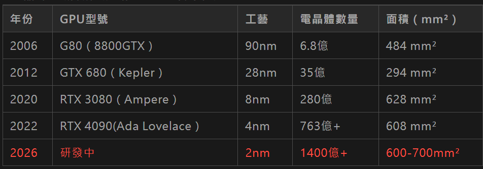 GPU電晶體多、面積大(動輒500~800 mm²),良率控制更為困難,導致生產成本極高。
