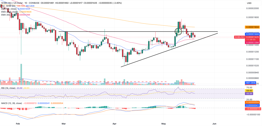 目前有多個關鍵支撐位值得關注,包括 21 日與 50 日 EMA、三角形的下方趨勢線,以及此波上漲趨勢中次高點 $0.00001420。