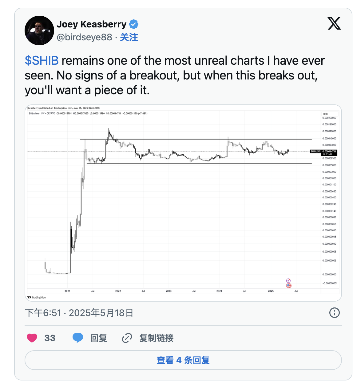 加密交易員 Joey Keasberry 強調,柴犬幣(Shiba Inu)的價格走勢圖展現出「不真實」的特徵,因為它已經盤整了將近四年。
